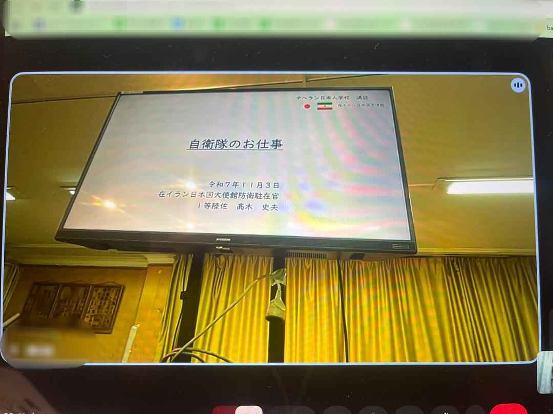 今年のマドレセサロンの講師は、在イラン日本国大使館の高木防衛駐在官でした。私たちは日頃から親しみを込めて「武官」と呼ばせていただいていますが、それも高木さんの温かいお人柄によるものです。今回の講演では、防衛駐在官としての任務や、自衛隊の組織・主な活動について、分かりやすくお話しいただきました。