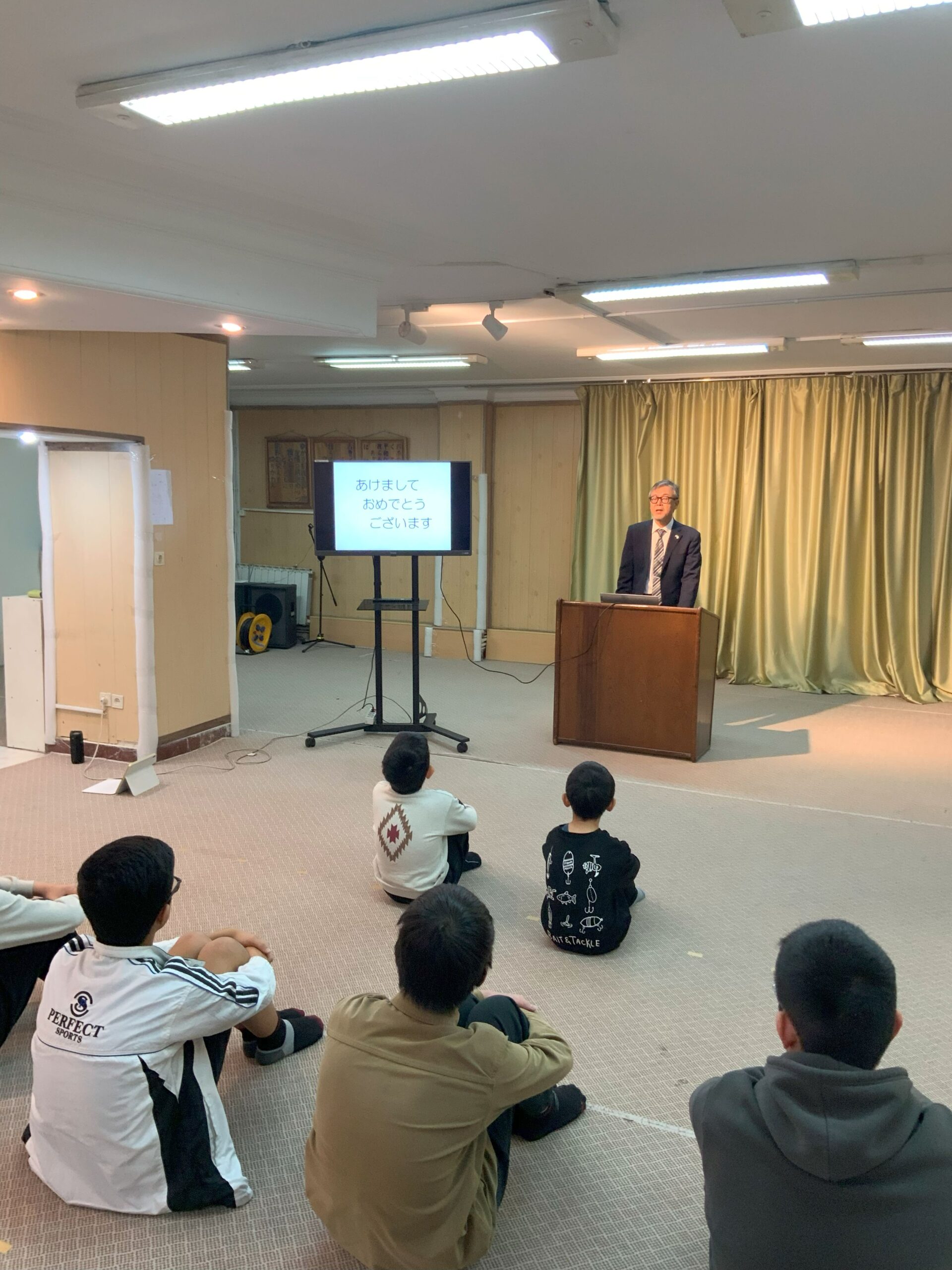今日から2026年の学校生活がスタートし、子供たちが講堂に集いました。校長から、七草のひとつであるせりにちなんで、「互いに競り合って力を伸ばそう」という話がありました。子供たちは、新年に頑張りたいことへの思いを